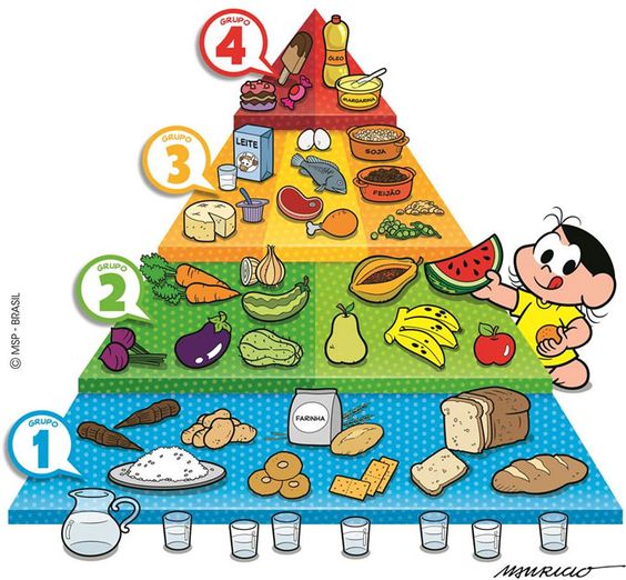 A pirâmide alimentar serve para mostrar, visualmente, quais tipos de alimentos devemos ingerir em maior ou menor quantidade. Na base, estão os alimentos que devem ser mais consumidos: